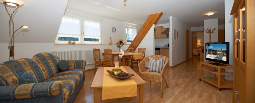 Die Ferienwohnung "Talblick" hat 63 qm mit Schlafzimmer, großzügigem Wohn- /Essbereich und separater komplett ausgestatteter Küchenzeile mit Elektroherd, Backofen, Geschirrspülmaschine, Kühlschrank, Kaffeemaschine, Wasserkocher, Eierkocher und Toaster.